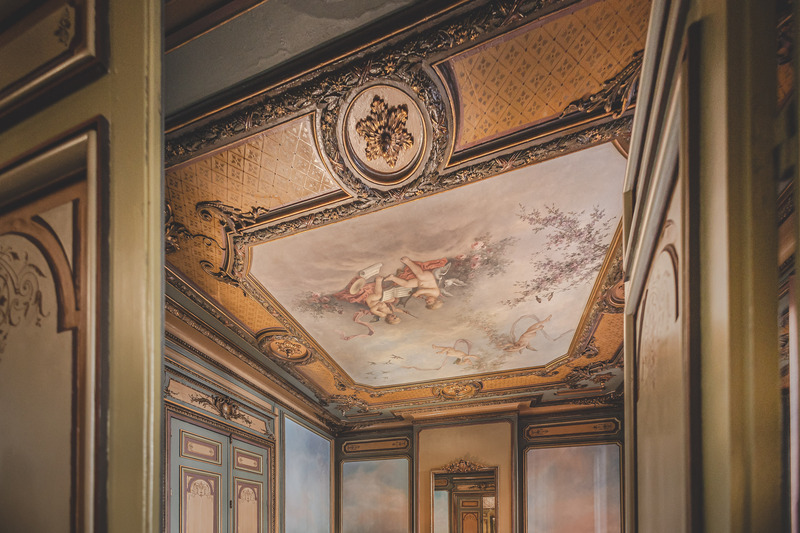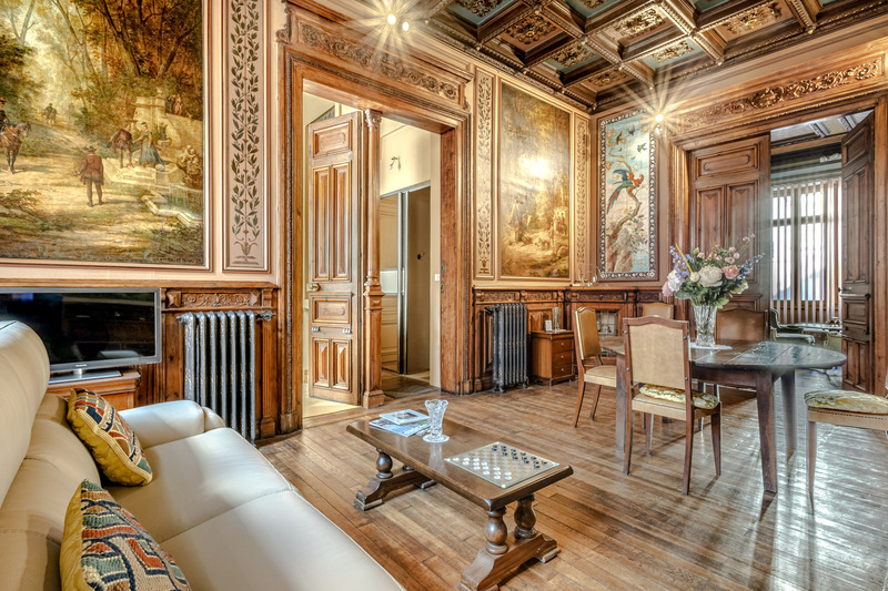 Depuis les amours musiciens en toile de plafond réalisée par le peintre Etienne Furlaud, jusqu'aux retours de chasse représentés sur les murs par Henry De Gray, en passant par les portes aux serrures en bronze et boiseries sculptées, absolument tout est remarquable dans cet appartement.