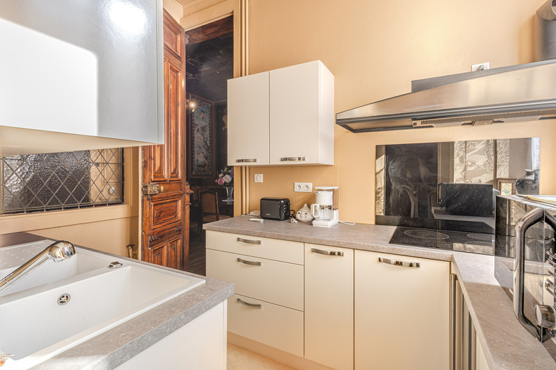 Haut sous plafond et entièrement parqueté, trois pièces se succèdent, toutes équipées de radiateurs en fonte datant de fin 19ème, la salle à manger abrite de splendides vitraux d'origine et une belle cheminée en chêne et noyer, côté rue nous trouvons du survitrage ainsi que le séjour, disposant d'une superbe cheminée en marbre, et la magnifique chambre avec sa literie faite sur-mesure.