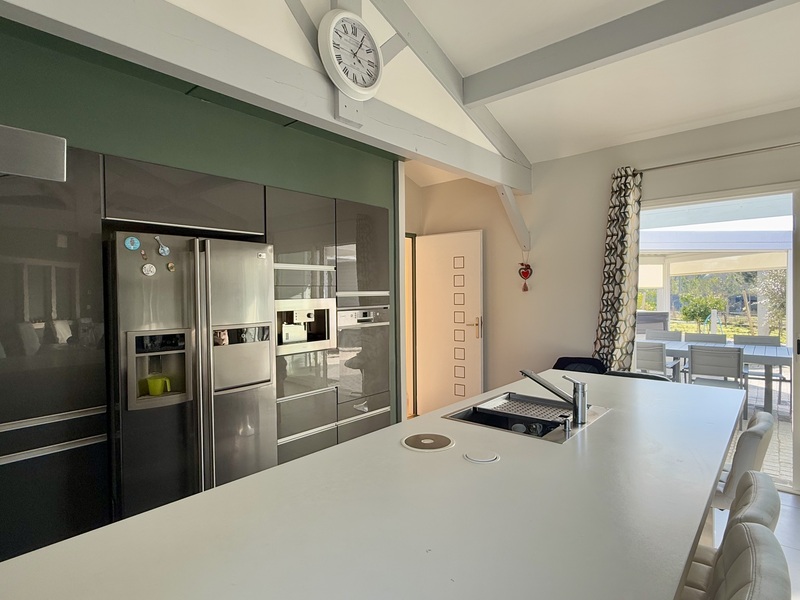 Dès votre arrivée, vous découvrirez une grande pièce de vie de 80 m² traversante, baignée de lumière, avec une cuisine ouverte entièrement équipée. Cet espace chaleureux s’ouvre sur une terrasse en pavés de granit, véritable prolongement de la maison et lieu parfait pour recevoir ou profiter des beaux jours en toute tranquillité.