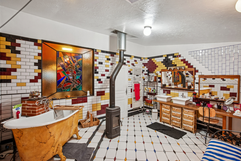 La salle de bain au style affirmé et authentique, avec baignoire îlot, douche, mosaïques et poêles à bois, en fait un espace de détente confortable.