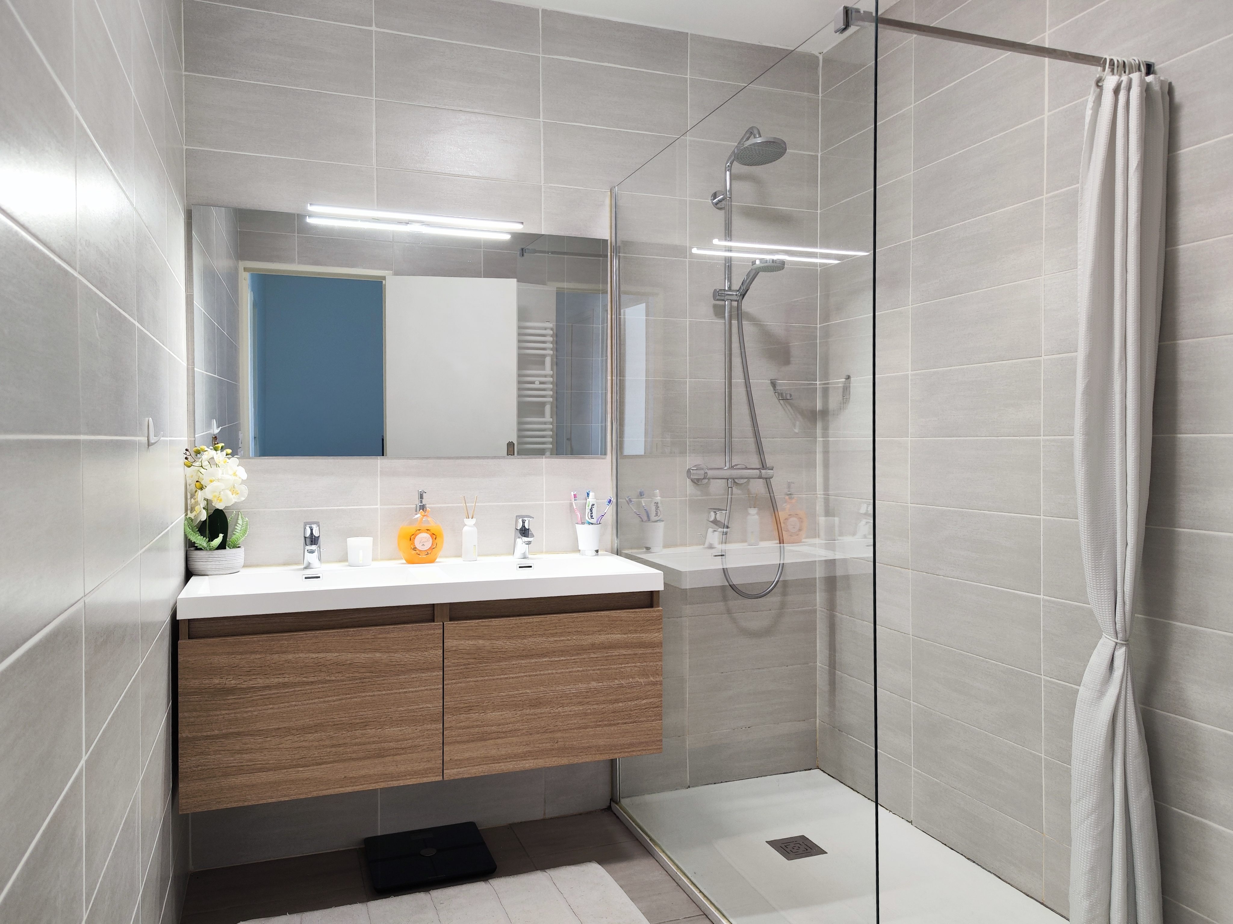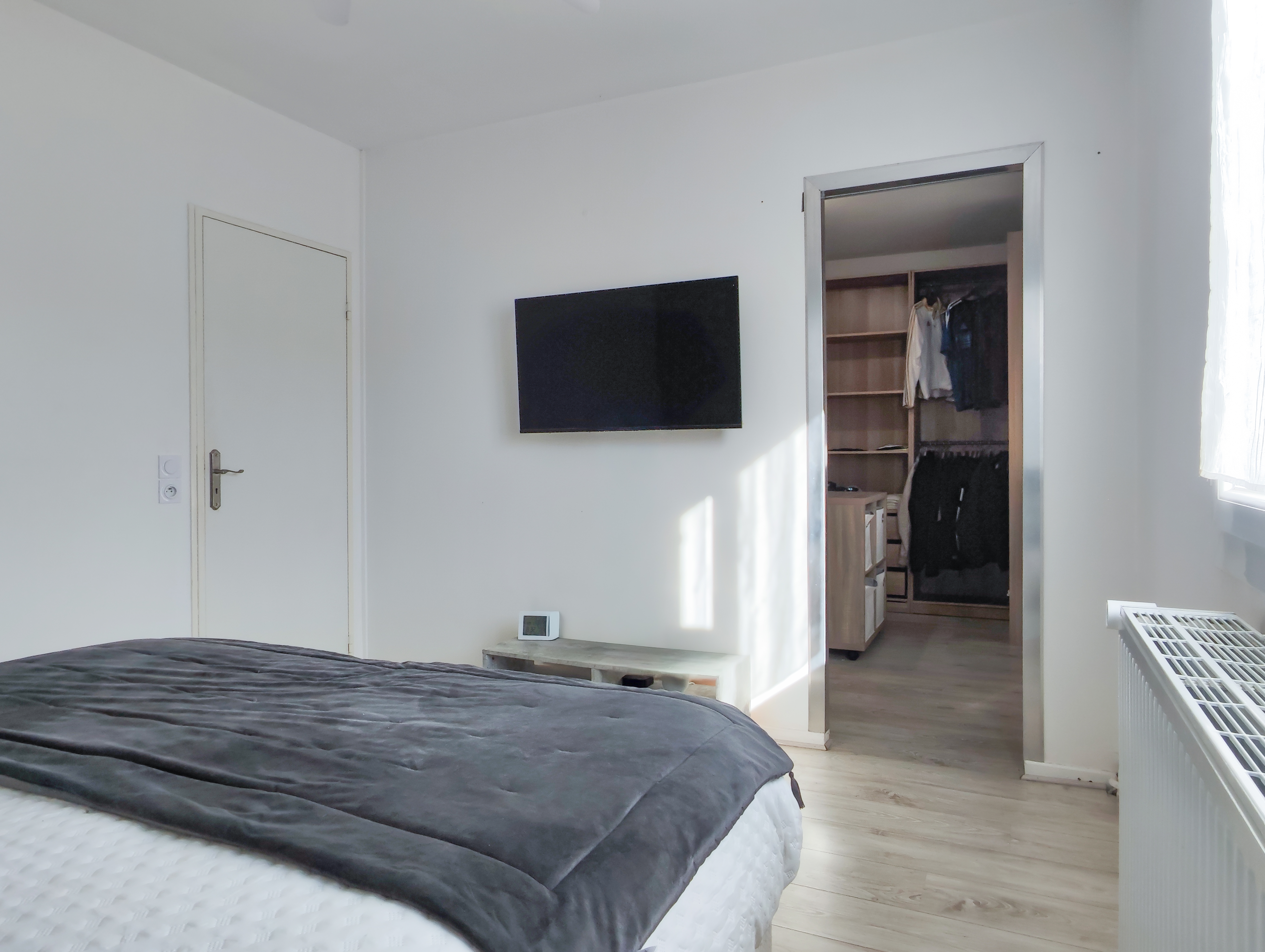 À l’étage, trois chambres confortables et un dressing sur mesure pouvant redevenir une quatrième chambre, ainsi qu’une salle d’eau contemporaine avec douche à l’italienne.
