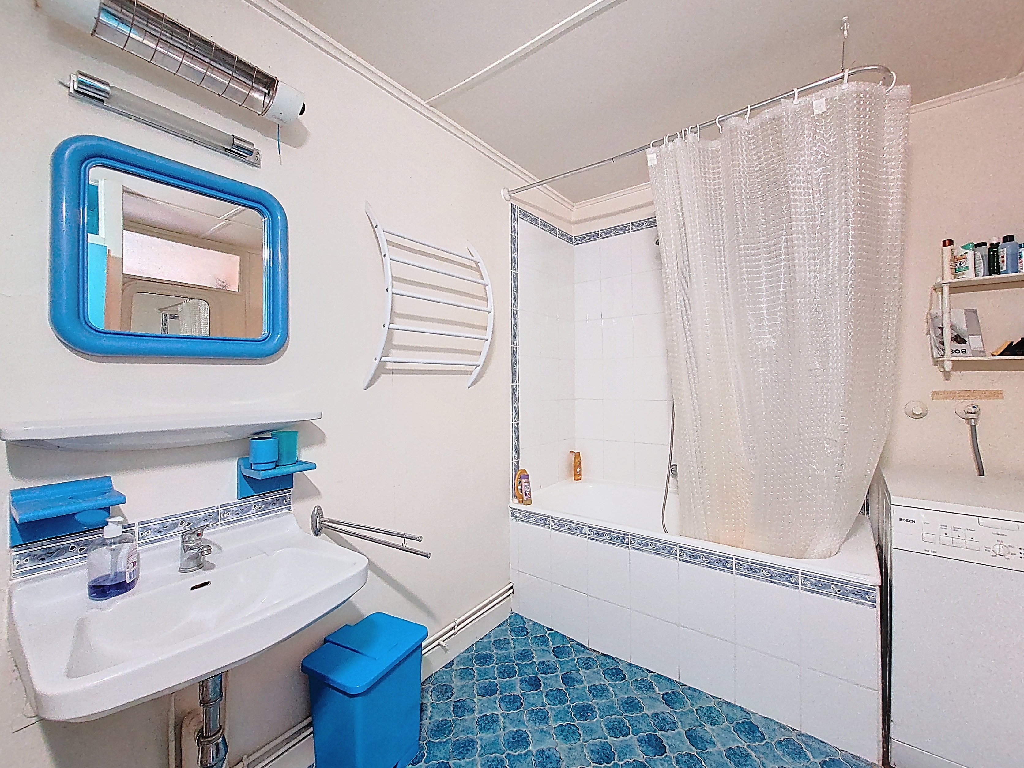 -Une salle de bains avec baignoire, lavabo et placard intégré