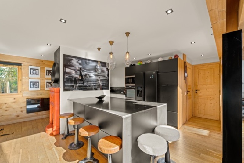 Idéalement situé à proximité immédiate du centre de Chamonix, magnifique chalet standing de 160 m² sur un terrain paysagé de 828 m², parfaitement exposé Sud-Ouest.