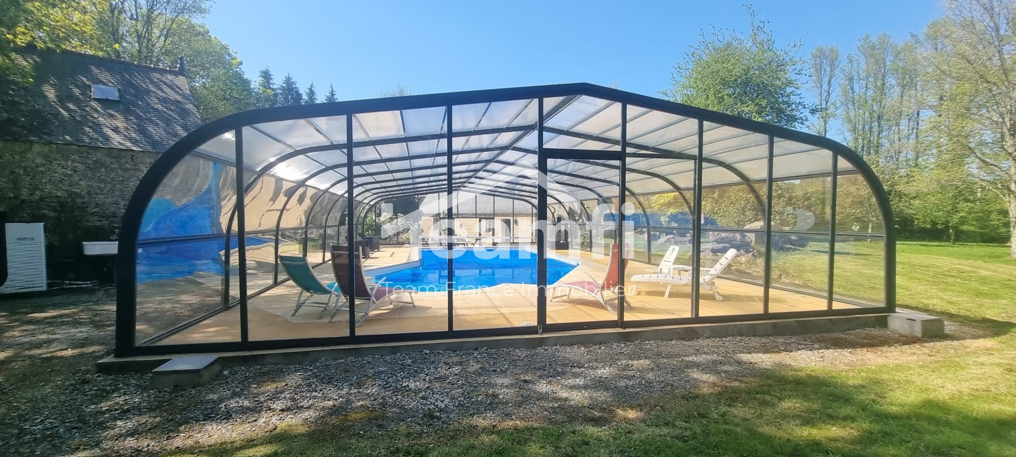 Venez découvrir sur un terrain de plus d'un hectare cette magnifique propriété en pierres avec sa piscine couverte. La maison est composée en différentes parties. Au rez-de-chaussée vous bénéficiez d'un grand séjour très lumineux qui ouvre sur une belle terrasse et le jardin, une cuisine aménagée et équipée avec un plafond cathédrale, un salon cosy avec poêle à bois, une chambre avec sa salle de bain privative et wc, une autre salle de bain avec espace buanderie, deux douches individuelles et wc, un autre salon détente avec poêle à bois également et un autre wc. A l'étage vous profitez de cinq chambres et un wc séparé. La piscine extérieure couverte (environ 160 m² de dôme) est chauffée par pompe à chaleur et bénéficie d’une filtration au sable. Un espace douche est à disposition pour plus de confort. Des dépendances en pierres sont également utilisées en chaufferie, atelier de stockage et autres mais peuvent permettre un agrandissement. Cette propriété est actuellement exploitée en gîte mais se prête à de nombreux projets : grande maison familiale, chambres d’hôtes, résidence secondaire… Sa situation permet d'accéder aux plages en 15 minutes en voiture, la gare SNCF à 10 minutes et l'aéroport à 40 minutes. Les commerces et écoles sont accessibles rapidement. « Ce bien est à vendre en vente interactive réalisée par ENCHERES IMMO. Aucuns frais supplémentaires ne sont à prévoir ni pour l'acquéreur, ni pour le vendeur. La participation à la vente interactive est soumise à agrément préalable. Toutes les offres seront transmises au vendeur, lequel restera libre dans la sélection de l'offre à laquelle il entend donner suite. Une offre en ligne pendant la vente interactive ne constitue pas une offre ferme et définitive au sens de l'article 1114 du Code Civil, mais une simple intention d'achat. Le prix affiché correspond à un prix de première offre possible honoraires de négociation inclus, étant précisé que ledit prix n’étant pas forcément un prix auquel le vendeur souhaite vendre. ». N’attendez plus pour organiser une visite et découvrir tout le potentiel de cette belle propriété. Contactez-moi dès maintenant ! Honoraires à la charge du vendeur. Classe énergie D, Classe climat D Montant moyen estimé des dépenses annuelles d'énergie pour un usage standard, établi à partir des prix de l'énergie de l'année 2021 : entre 3400.00 et 4601.00 €. Les informations sur les risques auxquels ce bien est exposé sont disponibles sur le site Géorisques : georisques.gouv.fr. Votre conseiller TEAMFI Team France Immobilier : Gaëlle LE ROUX Agent commercial (Entreprise individuelle) RSAC 904 408 903. VENTE - ACHAT - GESTION LOCATIVE - LOCATION TeamFi recrute, formation assurée. Devenez apporteur d'affaires en complément de revenus, contactez-nous ! La présente annonce immobilière a été rédigée sous la responsabilité éditoriale du mandataire indépendant en immobilier.