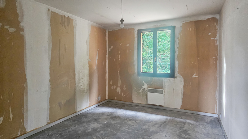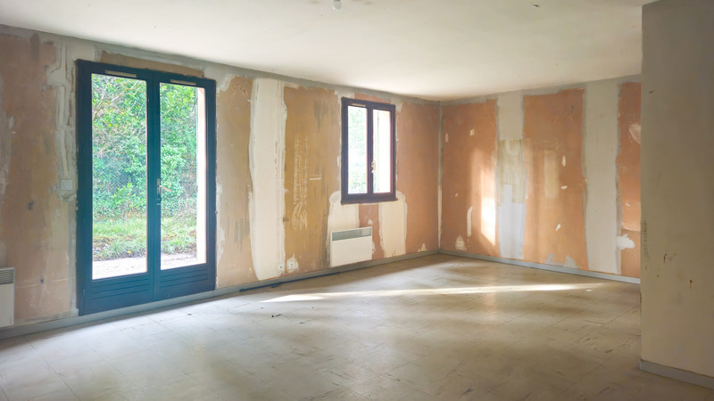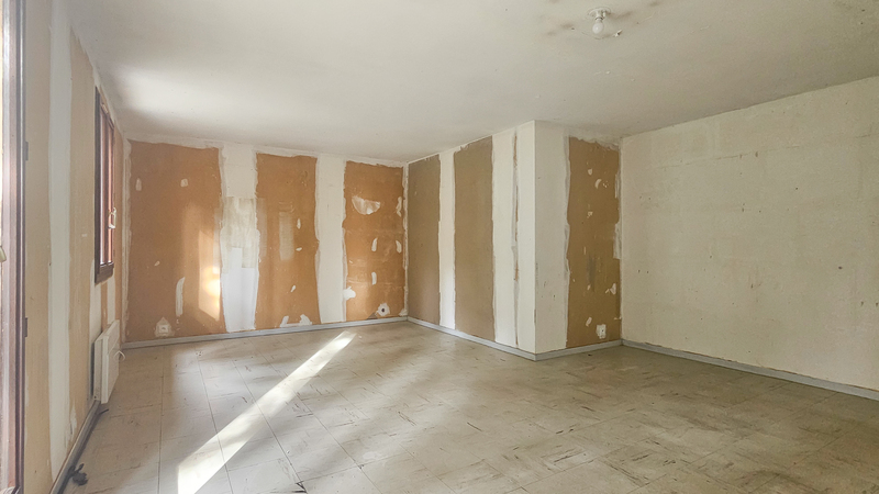L'organisation intérieure se compose de quatre pièces principales, dont un séjour de 30 m² bénéficiant d'une exposition Sud-Ouest. La partie jour comprend également une cuisine indépendante, un cellier et un WC séparé. L'espace nuit est constitué de trois chambres. La structure de la maison, caractérisée par des pièces aux volumes carrés et des murs bruts, facilite une rénovation globale et fonctionnelle selon les besoins des futurs acquéreurs.